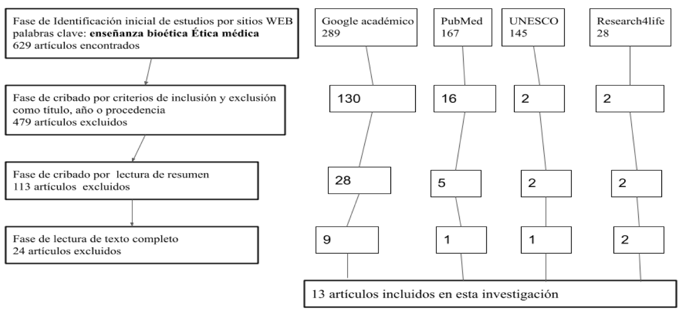 Tras la búsqueda inicial en los buscadores de Google académico, PubMed, UNESCO Y RESEARCH4LIFE se localizaron 629 estudios, de estos se excluyeron 479 que no fueron relevantes para el objetivo de esta revisión, es decir que informaran sobre las asignaturas de Ética Médica y Bioética, en relación con su contenido temático, estrategias de enseñanza y la evaluación de resultados. Finalmente se seleccionaron 3 revisiones sistemáticas, 5 estudios descriptivos de corte transversal y 5 artículos narrativos.