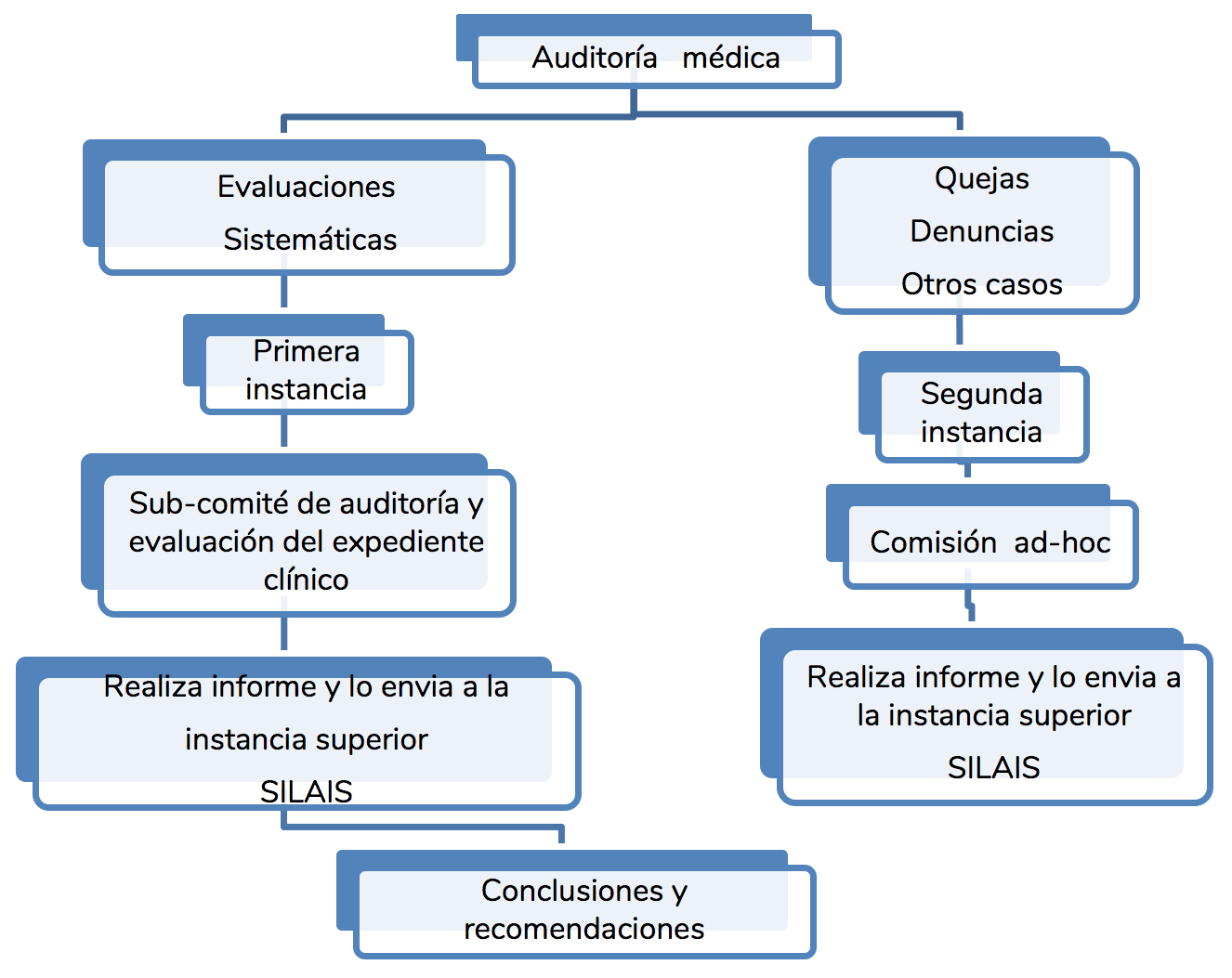 En Nicaragua, también se ha iniciado con las AM desde el siglo XX alrededor de los años 60 y 70; pero, es hasta la década de los 90 que se crea la oficina de apoyo para la realización de las mismas. La ley 423: Ley General de Salud, (2002) y en la normativa 090 Norma y Manual de Autoría de la Calidad de la atención Médica, (2012) refiere las funciones de las auditorias. Una de las cuales es evaluar el cumplimiento de las normas y protocolos de atención médica, está diseñado exclusivamente para la actuación del galeno lo cual limita su propia función porque en el proceso de atención de la salud interactúan más perfiles con responsabilidades inherentes según sus capacidades técnicas científicas (Ministerio de Salud, 2012).