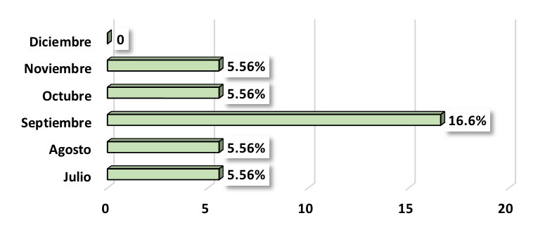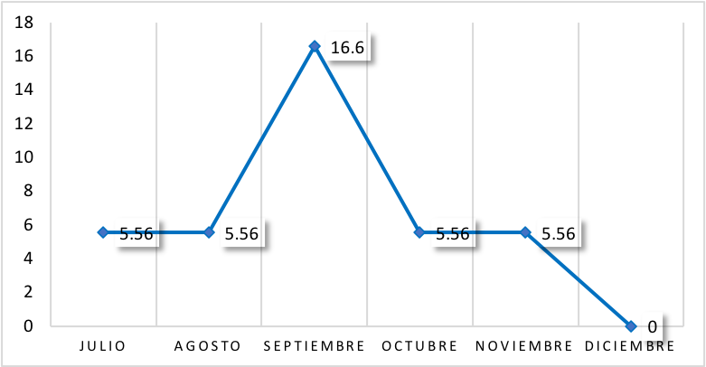 Se logra apreciar el Índice de Breteau que relaciona los depósitos con la presencia de larvas del vector con el número de casas inspeccionadas. De un total de 126 viviendas, solo 48 registraron presencia de depósitos positivos de Aedes aegypti. La distribución mensual fue la siguiente: en julio y agosto, se detectaron depósitos en 14 viviendas cada mes, lo que representa el 5.56% del total; en septiembre, se encontraron en 20 viviendas, equivalente al 16.6%; en octubre y noviembre, nuevamente se observaron en 14 viviendas cada mes, manteniendo el 5.56%. En diciembre, no se registraron viviendas con depósitos positivos.