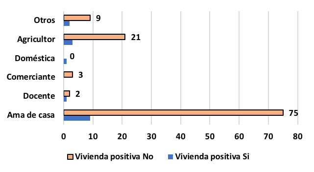 En relación con la ocupación, 84 personas son ama de casa; de éstas, 75 viviendas (89.3%) se encontraron negativas de Aedes aegypti y 9 (10.7%) fueron positivas; seguido de 24 agricultores, de los cuales 3 viviendas (12.5%) se encontraron positivas y 21 (87.5%) fueron negativas. Se obtuvo Chi cuadrado con un valor de p de 0.10, se deduce que no existe relación estadísticamente significativa entre la ocupación del morador y la positividad o no de la vivienda.