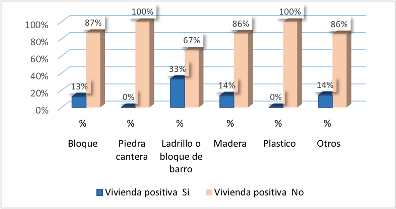 De las 126 viviendas visitadas e inspeccionadas, 87 son de bloque, de éstas 11(13%) son positivas de Aedes Aegypti y 76 (87%) fueron negativas; 4 viviendas son de piedra cantera, el 100% de estas negativas de Aedes aegypti; 3 viviendas de ladrillo, una (33%) positiva. También hay 22 viviendas de madera, de éstas 3 positivas (14%); 3 viviendas de plástico las cuales son 100% negativas. Al calcular el Chí cuadrado, con valor de p de 0.77, se obtiene que no existe relación entre el tipo de pared y la positividad o no de la vivienda.