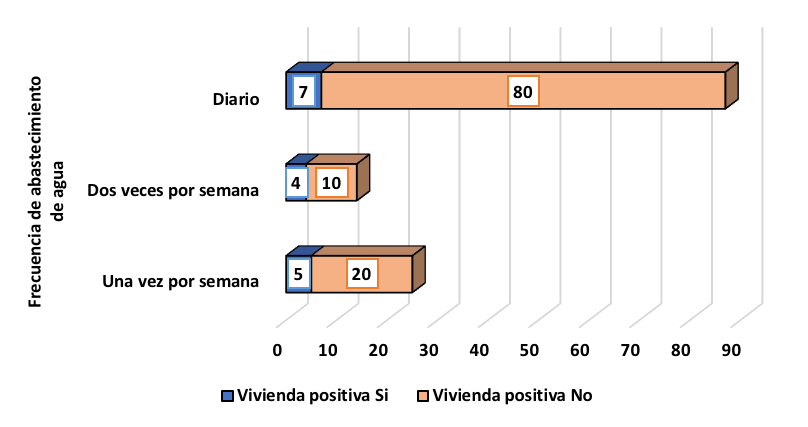 De 126 viviendas inspeccionadas en este estudio, 87 tienen abastecimiento diario de agua potable, de éstas solo el 8% (7 viviendas) fueron positivas de Aedes aegypti. De igual forma, 25 viviendas solo reciben abastecimiento una vez a la semana, resultando 5 positivas (20% de las viviendas) y 14 viviendas reciben abastecimiento 2 veces a la semana, de éstas 4(28.6%) resultaron positivas.