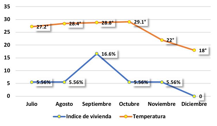 Durante el mes de septiembre se observa un incremento de 16.6 de Aedes aegypti con descenso hasta 0 en el mes de diciembre, el cual coincide con el descenso de la temperatura hasta 18°. Sin embargo, al realizar correlación de Pearson con un valor de p de 0.15, se obtiene que no existe relación estadísticamente significativa entre la temperatura y el índice de vivienda. Esto difiere con el estudio realizado por Reyes (2020), donde se evidenció que al incrementar las temperaturas (35,2°C; 35,8°C; 36,4°C), incrementaba la incidencia de arbovirosis.
