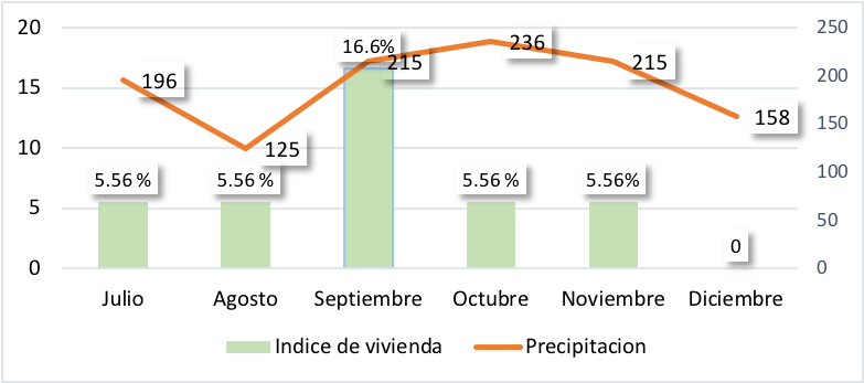 De un total de 126 viviendas solamente 48 presentaron positividad de presencia de Aedes aegypti, observándose un índice inicial de 5.56 (14 viviendas), sostenido hasta el mes de agosto, con un incremento del índice de vivienda hasta 16.6 (20 viviendas) en el mes de septiembre con disminución en el mes de octubre y noviembre hasta 5.56 (14 viviendas), alcanzando 0 en diciembre.