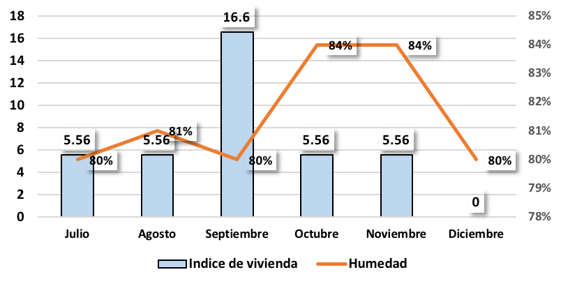 Al analizar el factor humedad vrs el índice de vivienda en los meses de julio a diciembre, se obtuvo que en el mes de septiembre se observa un incremento de 16.6, con un grado de humedad de 80%. Posteriormente se observa un leve incremento de la humedad de 4% con un descenso del índice de vivienda hasta 5.56 y descenso en el índice de vivienda en el mes de diciembre hasta 0, con 80% de humedad. Al realizar correlación de Pearson, con un valor de p de 0.28, se obtiene que no existe relación estadísticamente significativa entre el índice de vivienda y la humedad.