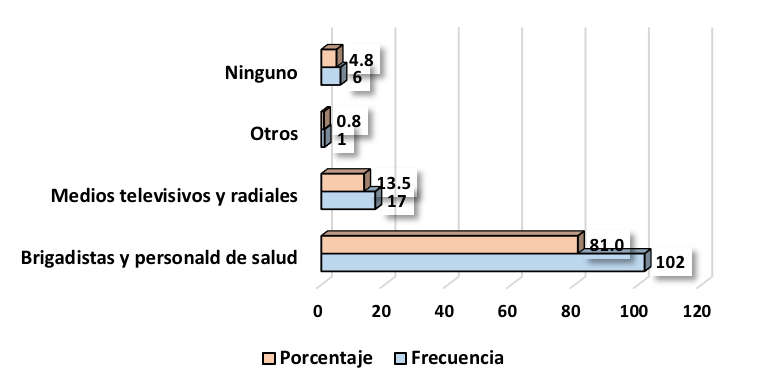 Al consultar a la población sobre el medio a través del cual recibe información sobre el dengue, 102 personas (81%) respondieron a través de consejería por los brigadistas y personal de salud; 17 personas (13.5%) a través de medios televisivos y radiales y 1 persona (0.8%,) a través de otras fuentes. Además 6 personas refirieron que no habían recibido información de ningún medio.