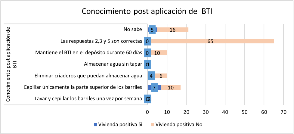 De 126 personas que participaron en el estudio, 65 realizan prácticas adecuadas post aplicación BTI, encontrando de éstas el 100% de viviendas negativas de criaderos de Aedes Aegypti. Además, 21 personas refirieron que no conocen las acciones post aplicación de BTI, encontrando de éstos, 5 viviendas positivas lo cual corresponde al 23.8%%; 17 personas refirieron que cepillan únicamente la parte superior del recipiente, resultando 7 viviendas positivas (41.2%). Se calculó Chi cuadrado, con un valor de p de 0.000011, se deduce que existe relación significativa entre las acciones post aplicación de BTI y la positividad o no de la vivienda.