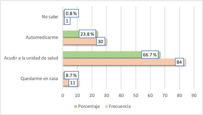De 126 personas que participaron en el estudio, 84 (66%) acudirían a la unidad de salud; 30 (24 %) se auto medicaría, 11 (9%) se quedarían en su casa y uno (1%) no sabe la conducta a seguir.