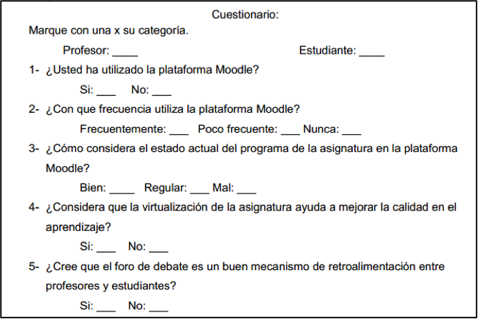 En el caso del proyecto de Carreteras en la Universidad de Holguín se realiza un diagnóstico del estado de la virtualización de la asignatura teniendo en cuenta la siguiente encuesta: