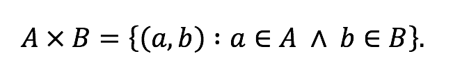 Producto cartesiano: El producto cartesiano de los conjuntos A y B es el conjunto cuyos elementos son todos los pares ordenados cuya primera componente pertenece a A y la segunda a B. Simbólicamente,