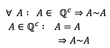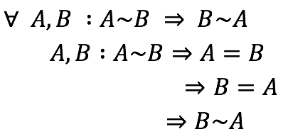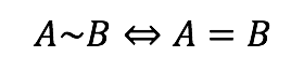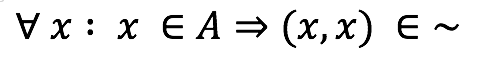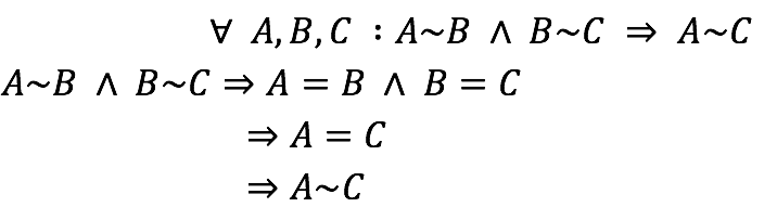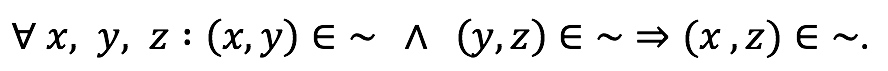 Relación de equivalencia: La relación ~⊂A2 es de equivalencia en A si, y solo si, es reflexiva, simétrica y transitiva.