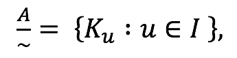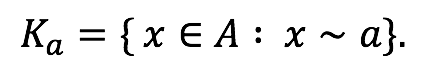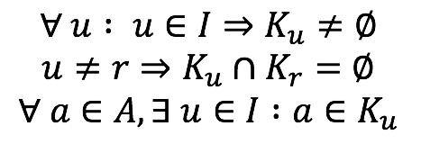 Partición: Sean dos conjuntos A ≠ ∅ e I ≠ ∅ tales que, cualquiera que sea el elemento u ∈ I, existe un subconjunto Ku ⊂ A. El conjunto {Ku∶u ∈ I} es una partición de A si y solo si