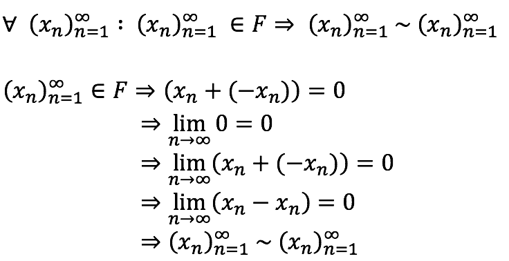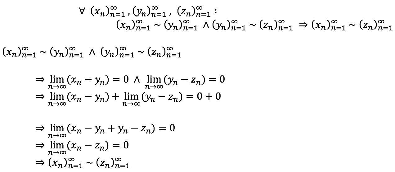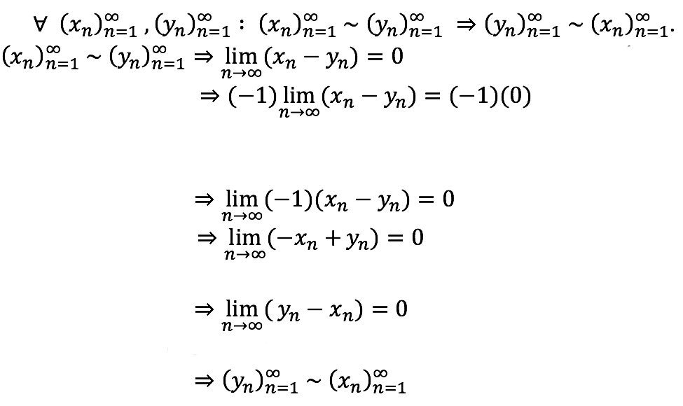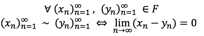 Entonces, esta relación de equivalencia establece que dos secuencias son equivalentes si la diferencia entre los términos correspondientes de las secuencias converge a cero cuando tiende a infinito.