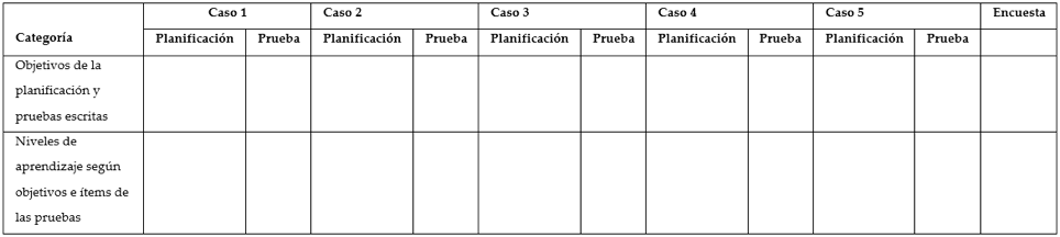La información de la revisión documental se ordenó en dicha matriz adaptada de la propuesta de Monje (2011) quien explica que es muy parecida a una matriz de datos, en este caso, retomando para las columnas los elementos de la planificación y las pruebas, además, para las filas dos categorías de análisis, posteriormente, se realizó una comparativa con los resultados de la encuesta complementaria.