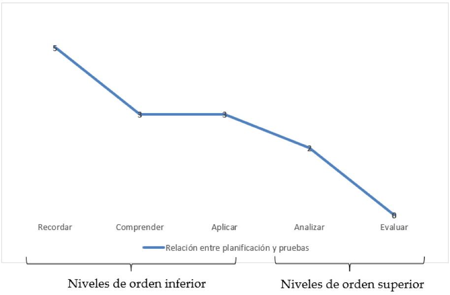 A partir de lo anterior, se concluye que, la correspondencia entre las pruebas y la planificación docente varía de acuerdo con el nivel cognitivo del aprendizaje que retomen de la Taxonomía de Bloom, es decir que, es más fácil encontrar una correspondencia entre la planificación y las pruebas cuando se evalúan niveles de orden inferior (recordar, comprender y aplicar), sin embargo, es más difícil encontrar una correspondencia cuando se trata de los niveles de orden superior (analizar y evaluar) donde se aprecia que la relación es poca o nula. Dicha relación se puede concretar en la siguiente figura: