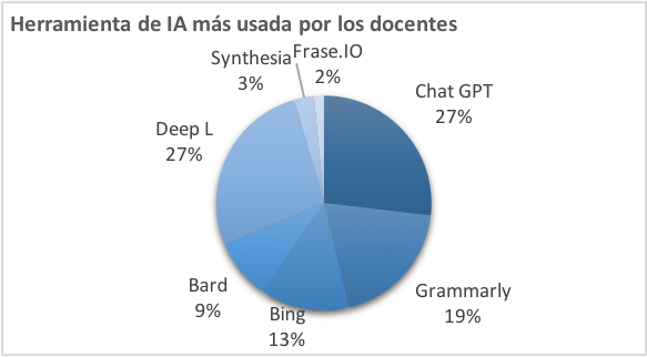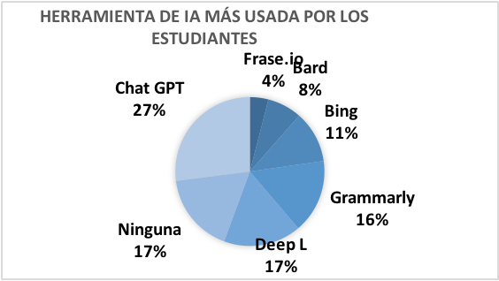 En lo que refiere a la herramienta de IA más usada por los docentes y estudiantes se obtuvo que la mayoría han utilizado Chat GPT, DeepL, y Grammarly1 . Por lo tanto, se puede concluir que las herramientas con más usuarios son las que generan contenido como es el caso de Chat GPT debido a que este programa es el mejor hasta el momento para producir textos (ensayos, poemas, cuentos etc.) de tal manera que pueden confundirse con escritos realizados por los humanos.
