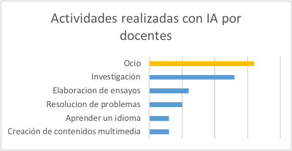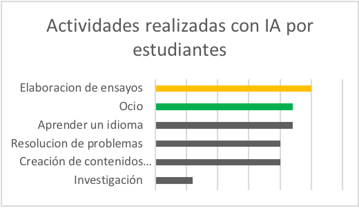 En cambio, los estudiantes la han utilizado para elaborar ensayos. Los resultados de esta investigación coinciden con los datos obtenidos por Corredor, (s.f.) quien afirma que la mayoría de sus encuestados (docentes y estudiantes) han utilizado herramientas como ChatGPT principalmente para actividades de consulta en contextos académicos específicos, como en trabajos escritos y en proyectos de investigación. Cabe señalar, como dato coincidente, que tanto docentes como estudiantes usan la IA principalmente para el “ocio”. Es decir, por curiosidad sobre su funcionamiento y sus posibles aplicaciones.