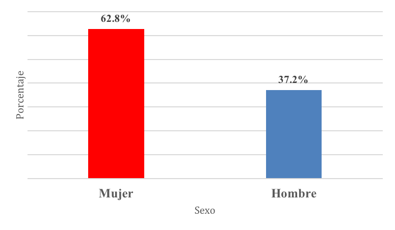 Se observó que un 62.8% (n= 201) de los casos eran del sexo femenino, el sexo masculino represento el 37.2% (n=119) (Figura 3), esto es un hallazgo llamativo debido que en otras poblaciones fueron más afectados las personas del sexo masculino (Henriquez-Marquez, 2021) (Otoya-Tono, 2020) . Esta diferencia puede ser porque en esta cohorte se tiene más mujeres que hombres en la edad adulta. El análisis estadístico de Chi2 no demostró diferencia significativa en el género.