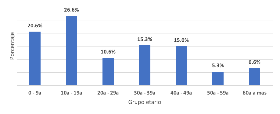 En China los síntomas más frecuentes fueron fiebre (80%) y dificultad respiratoria (40%) (Alvarez, 2020). En Argentina, el grupo etario más afectado fue entre 30 a 39 años registrando la mayor tasa específica por edad (7601.3/ 100,000 habitantes), con los menores de 20 años teniendo un 9.2% positividad (Pérez, 2021). En menores de edad la sintomatología es similar a adultos, con una enfermedad más leve (Acosta Torres, 2020) (Rosa María Wong-Chewa, 2022) (Guo, 2020). Hasta la fecha y de acuerdo a la información disponible, los pacientes pediátricos diagnosticados con COVID-19 pueden desarrollar en general desde cuadros clínicos respiratorios leves no complicados (la mayoría) hasta Síndrome de Dificultad Respiratorio Agudo (SDRA) (Alvarez, 2020).