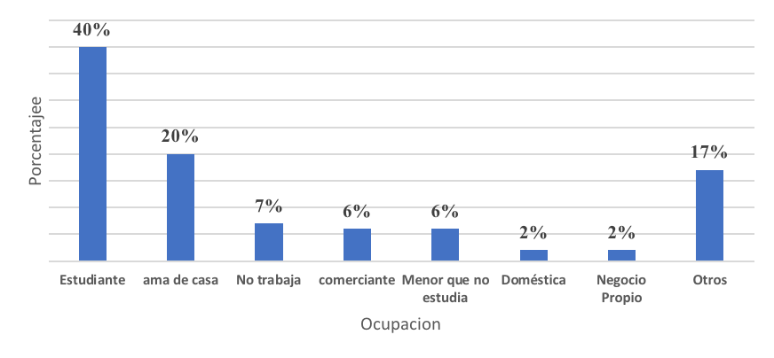 Se logró medir el nivel de escolaridad de los participantes. La mayoría de ellos presentaron un nivel de educación secundaria. En cuanto, a la ocupación actual, se observó que los estudiantes de educación inicial, primaria y secundaria, tuvieron la mayor incidencia de casos durante este periodo. De todos los casos positivos a SARS CoV 2, el 40% fueron estudiantes (n=116), amas de casa un 19.5% (n=56), personas que no trabajaban 6.6% (n=19), comerciantes y menores que no estudiaban fueron afectados en el 5.9% de los casos (n=17), 2% de los casos eran domésticas (n=7) y el 2% personas tienen negocio propio (n=7), un 16.7% pertenecían a otras ocupaciones.
