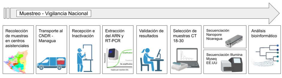 Las muestras secuenciadas son procedentes de la vigilancia nacional de SARS-CoV-2 del Ministerio de Salud (MINSA). Las muestras son tomadas en centros asistenciales de primer, segundo o tercer nivel en todo el territorio Nacional junto una ficha epidemiológica con datos de la muestra y del estado del paciente. Estas muestras fueron transportadas desde cada centro asistencial hacia los Sistema Local de Atención Integral en Salud (SILAIS) y desde aquí, con previa autorización, fueron transportadas en cadena de frío hasta el Laboratorio Nacional de Virología en el Centro Nacional de Diagnóstico y Referencia (CNDR) ubicado en el Complejo Nacional de Salud Concepción Palacios en la capital de Nicaragua, Managua.
