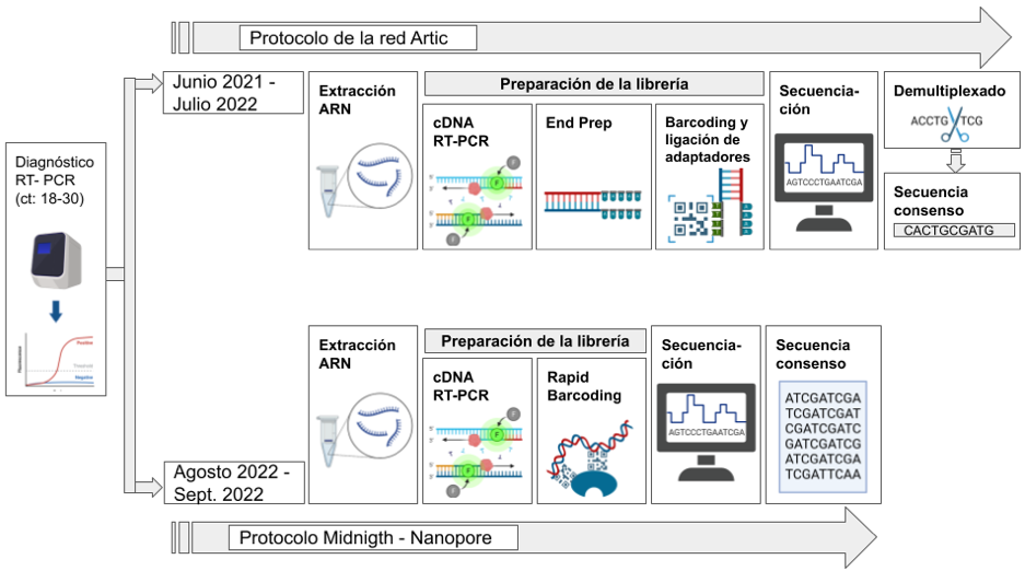 Posteriormente, se realizó una extracción de ARN utilizando el kit QIAGEN QIAamp® Viral RNA Mini. Para llevar a cabo la secuenciación se utilizó el protocolo de secuenciación de la red Artic (Artic Network, 2020) desde julio del 2020 hasta julio del 2021. A partir de agosto del 2022 se cambió el protocolo de trabajo de la red ARTIC por el protocolo Midnight de Oxford nanopore Technology (Oxford Nanopore Technolgies, 2021) (Figura 2).