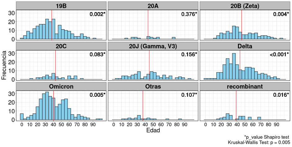 Se realizó el test de Shapiro Willk para determinar la normalidad de la distribución de la edad, donde se determinó que la edad en los grupos donde la n es más grande hay una distribución normal (Ver significancias en la figura 3), pero las muestras más pequeñas tienden a manifestar una distribución no normal. Al realizar el test de Kruskal Wallis para determinar diferencia de medias entre los diferentes grupos se encontró que hay diferencias entre las edades de los pacientes infectados con las distintas variantes (p =0.005).