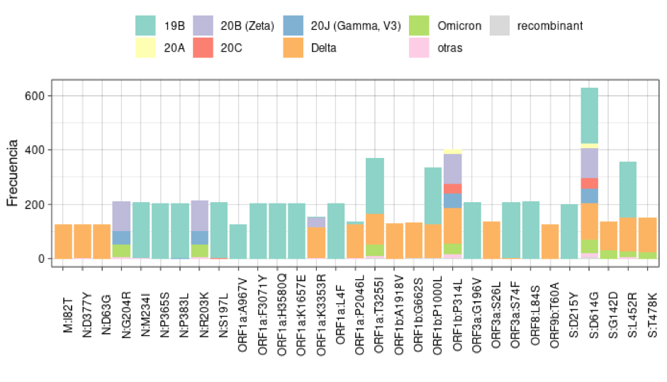 La secuenciación permitió identificar y cuantificar las 30 mutaciones más frecuentes en el conjunto de genomas de las variantes (Figura 4). Entre estas 30 mutaciones se identificaron mutaciones en distintas las regiones del genoma del SARS-CoV-2, como en la región M (que codifica para la proteína de membrana), la región N (que codifica para la proteína de la nucleocápside), los genes ORF1a, ORF1b y ORF3a (marcos de lectura abierto) y genes que codifican para la proteína S (Spike).
