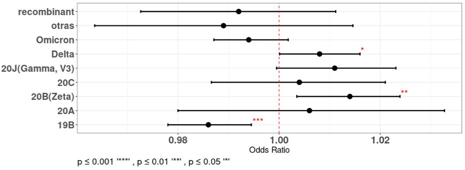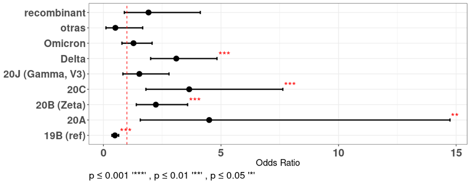Con la finalidad de investigar la asociación entre diferentes variantes del SARS-CoV-2 y la hospitalización se utilizó un modelo de regresión logística multivariada. Se observó que varias pre-variantes y variantes: "20A", "20B (Zeta)", "20C" y "Delta", se asociaron significativamente con un mayor riesgo de hospitalización, con ORs que oscilan entre 1.5 y 15. Estos hallazgos indican que las personas infectadas con estas variantes específicas del SARS-CoV-2 tuvieron una mayor probabilidad de requerir hospitalización en comparación con las que fueron infectadas con la pre-variante del clado 19B. Por otro lado, algunos resultados no mostraron significancia estadística, las variantes "20J (Gamma, V3)", "Omicron" y las variantes recombinantes no mostraron una asociación estadísticamente significativa con la hospitalización (figura 6)