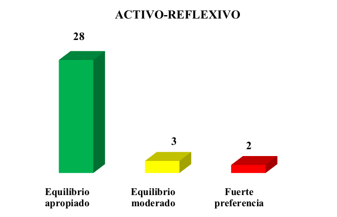 Según los resultados del perfil activo-reflexivo, un 84.8% (28 estudiantes) presenta un equilibrio apropiado, un 9.1% (3 estudiantes) muestra un equilibrio moderado, y un 6.1% (2 estudiantes) tiene una fuerte preferencia para procesar información de acuerdo con las características de su perfil. Estos resultados indican la necesidad de seleccionar estrategias de enseñanza que se adapten a las diversas formas en que los estudiantes prefieren procesar la información.