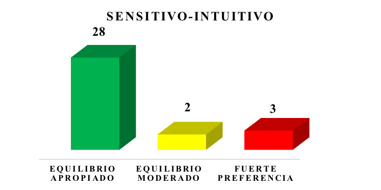 Según los resultados del perfil sensitivo-intuitivo, un 84.8% (28 estudiantes) presenta un equilibrio apropiado, un 6.1% (2 estudiantes) muestra un equilibrio moderado, y un 9.1% (3 estudiantes) tiene una fuerte preferencia para percibir información según las características de su perfil. Estos resultados indican la necesidad de seleccionar estrategias de enseñanza que se adapten a las diversas formas en que los estudiantes prefieren procesar la información.