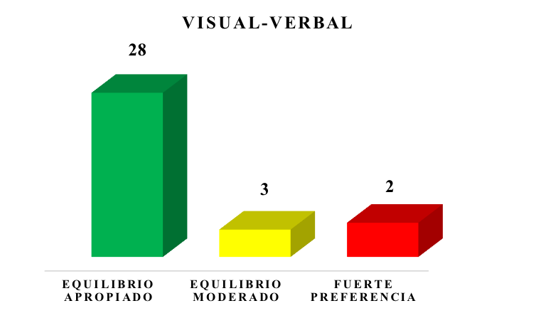 Según los resultados del perfil visual-verbal, un 84.8% (28 estudiantes) presenta un equilibrio apropiado, un 9.1% (3 estudiantes) muestra un equilibrio moderado, y un 6.1% (2 estudiantes) tiene una fuerte preferencia para percibir información según el canal sensorial. Estos resultados indican la necesidad de seleccionar estrategias de enseñanza que se adapten a las diversas formas en que los estudiantes prefieren procesar la información.