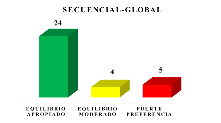 Según los resultados en el perfil secuencial-global un 72.7% (24) presenta un equilibrio apropiado, un 12.1% (4) presenta un equilibrio moderado, mientras que un 11.4% (5) presenta una fuerte preferencia para procesar procesa el aprendizaje en base a las características del perfil que permita seleccionar las estrategias de enseñanza más adecuadas.