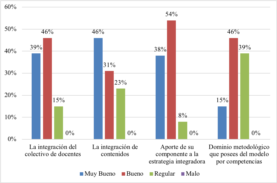 Respecto a la metodología utilizada en el modelo por competencia, los docentes tienen claro la importancia de la integración en los colectivos de semestre. El 85 % afirmó que se integra en los colectivos docentes para planificar y ejecutar las acciones necesarias para que los estudiantes construyan aprendizajes y por ende contribuir al desarrollo de competencias propias del campo laboral. No obstante, hay un 15% que menciona que su integración fue regular. Es importante señalar que el currículo integrado, establece nexos entre los componentes impartidos por cada docente, superando la visión fragmentada y desarticulada que ha prevalecido tradicionalmente, favoreciendo un aprendizaje más significativo y estructurado para el estudiantado (Arguedas-Ramirez y Camacho-Oviedo, 2021).