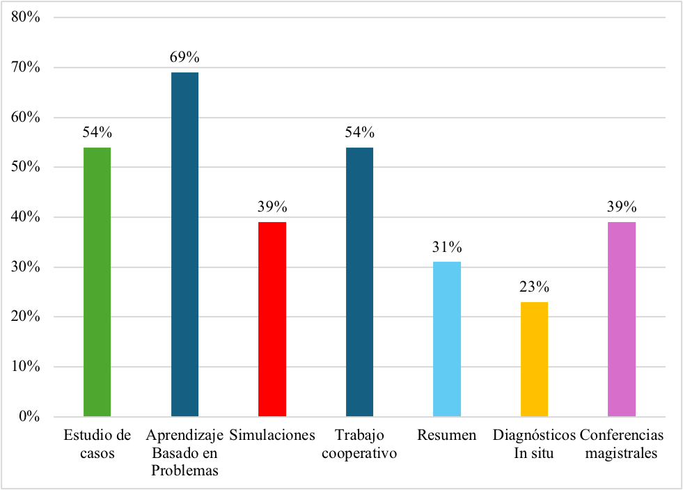 Con menor prioridad implementan las que permiten ejecuciones procedimentales y contacto directo con el campo de acción, tales como el uso de simulaciones (39%) y diagnóstico In situ (23%). Por tanto, los docentes encuestados perfilan sus estrategias didácticas, principalmente, para llevar el contexto de la profesión al aula mediante saberes conceptuales y en un segundo nivel de prioridad, llevar el aula al contexto de la profesión mediante saberes procedimentales.