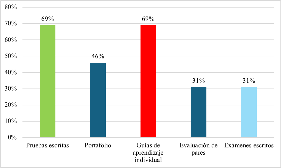 Sobre las estrategias de evaluación, a partir de los criterios establecidos por Calvo (2015), se infiere que, los docentes implementan estrategias vinculadas a distintos modelos. Las pruebas escritas (69%) y guías de aprendizajes individuales (69%), que son las principales estrategias aplicadas, muestran que, los docentes centran su sistema de evaluación en la heteroevaluación, además, los exámenes escritos (31%) utilizados en menor grado, refuerzan la idea del uso de un modelo tradicional, enfocado a un aprendizaje memorístico para el desarrollo de saberes conceptuales y con fines sumativos.