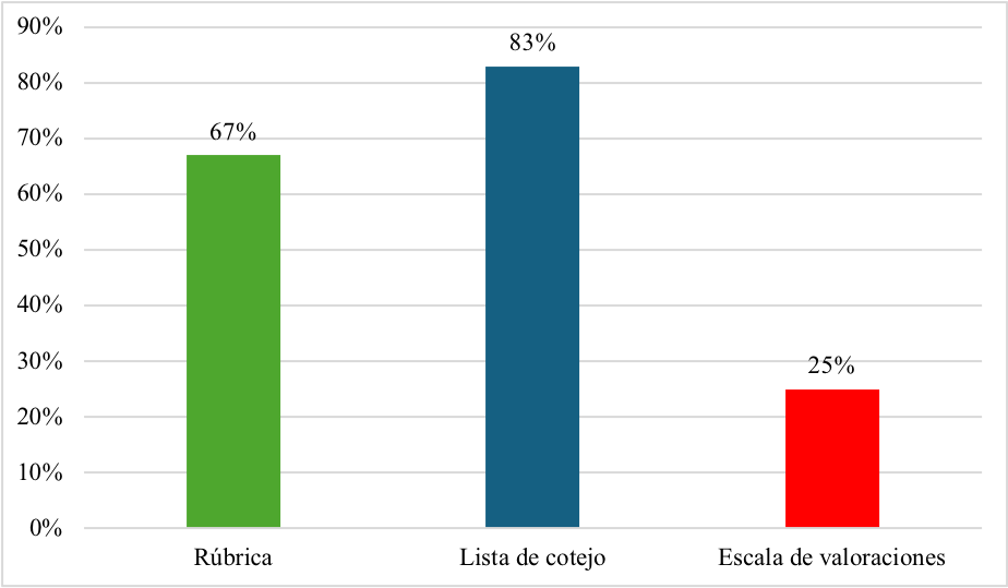 Con relación a los instrumentos de evaluación los encuestados indicaron mayormente usar la lista de cotejo y la rúbrica, solamente una minoría indicó la escala de valoraciones (ver figura 4). Al analizar se puede decir que existe poca relación entre las estrategias de evaluación que afirmaron utilizar los encuestados (ver figura3), con respecto a los instrumentos, dado que, la rúbrica y lista de cotejo, son instrumentos más dirigidos a evaluar procesos sistemáticos que conocimientos teóricos.
