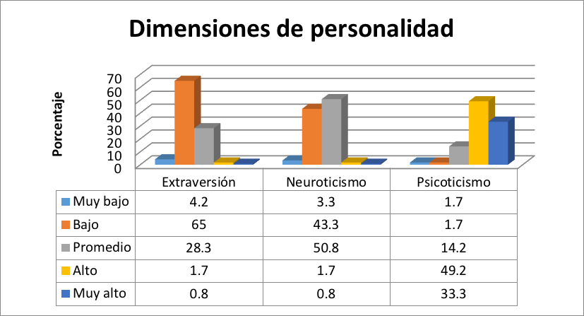 Tomando en cuenta que cada dimensión contiene un 100%, el cual se obtiene de la puntuación en cada nivel dentro del factor, lo que indica una particularidad de la personalidad de los sujetos. El 65% de la muestra se encuentra en la dimensión de extraversión en un nivel bajo, siendo este el extremo opuesto de lo propuesto por Eysenck (1947), lo que les otorgan características con tendencia a la timidez, pasiva, temerosa y pesimistas. En cuanto a la dimensión de neuroticismo el 50% de la muestra se ubica en un nivel promedio, revelando características de tipo tenso, ansioso e impulsivo, lo que demuestra como el factor N se evidencia su polo opuesto siendo esta estabilidad emocional.