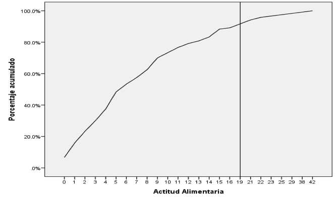 El 91% de la muestra no presentan riesgo de conducta alimentaria. Sin embargo, el 9% de la muestra indica que, son personas con tendencia a desarrollar conductas alimentarias de riesgo que podrían relacionarse con algún Trastorno de Conducta Alimentaria. Lo que se asemeja a los resultados obtenidos por Latino et al. (2013) en el que 98% de los estudiantes están normales sobre su conducta alimentaria y el 2% presentan riesgo de conducta alimentaria.