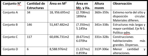 Tabla 1. Distribución de estructuras por conjunto, extensión, alturas en msnm