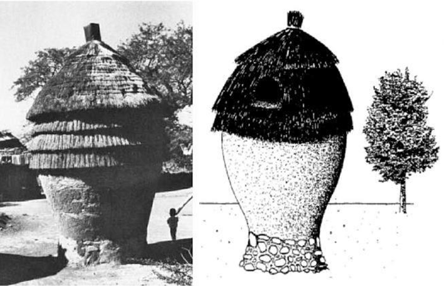 Se trata de graneros globulares o abombados de adobe o de barro crudo -también documentado en “Ciudad Perdida” mezclado con pastos, generalmente revestido de estuco, como el que se muestra en la imagen 4. Pueden descansar sobre un zócalo de piedra para proteger la cosecha de mazorcas de maíz de los roedores. Generalmente están ubicados en el patio, según (Seele y Tyrakowski 1985), referido por Manzanilla (1988).