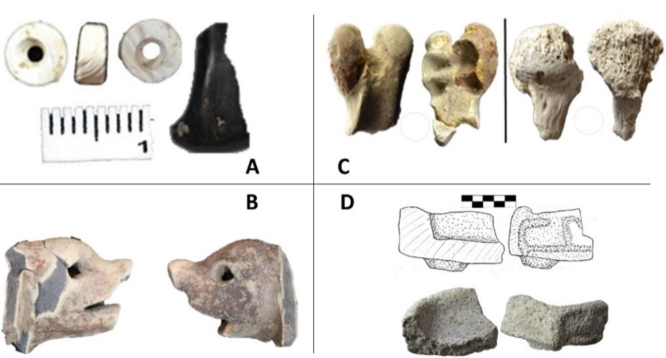 Figura 5: Materialidad recuperada en contexto. A, Cuenta de collar elaborada en hueso; B, figurillas con representación de mamífero; C, fragmentos de húmero de venado; mortero o molcajete con decoración incisa. La mayoría de ellas recuperadas en el M2. La imagen 4B fue recuperada en el M44. Fuente: Balladares, S. et al. 2022.