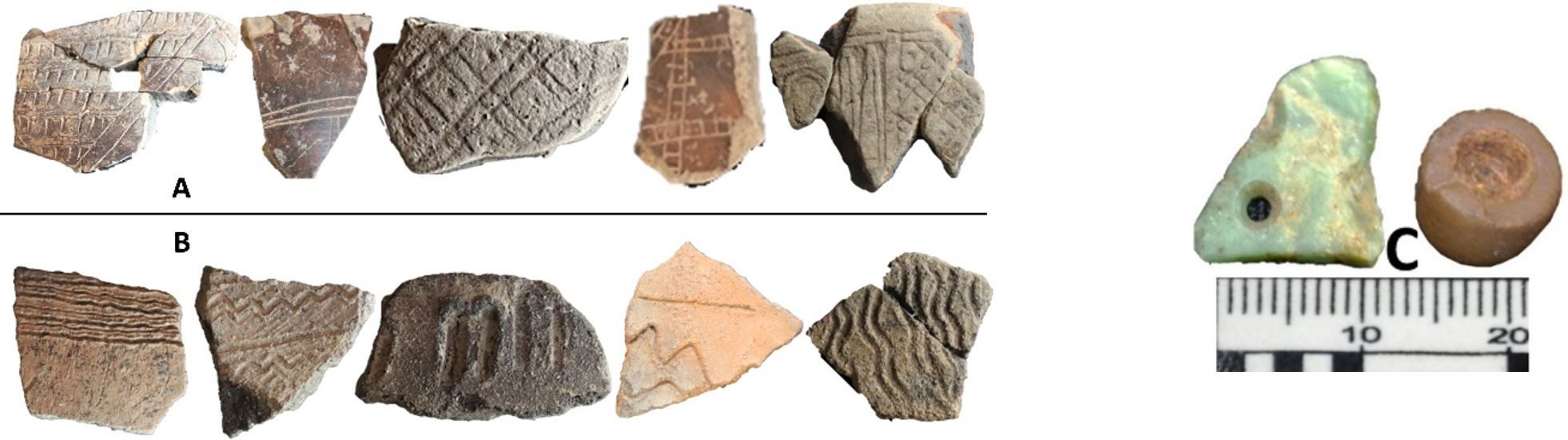Figura 6. Materialidad cerámica y ornamentos corporales. A, fragmentos cerámicos con incisos realizados cuando la pasta ya está seca o cocida; B, fragmentos cerámicos con impresos, brochados e incisos, con pasta aún húmeda; C, Dije elaborado en piedra verde y cuenta de collar en sílex. Fuente: Balladares, S. et al. 2022.