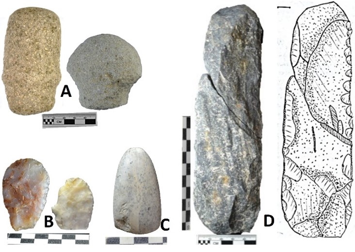 Figura 7: Herramientas en piedra recuperadas in situ. En la sección B, se observa un hacha tallada bifacialmente, mientras que en la sección C se muestra un hacha pulida, ambas recuperadas en el M44. En la sección A, se presentan manos de morteros, destacando que la de la izquierda tiene una forma fálica y la sección D exhibe un hacha tallada bifacialmente, también recuperada del M2. Fuente: Balladares, S. et al. 2022.