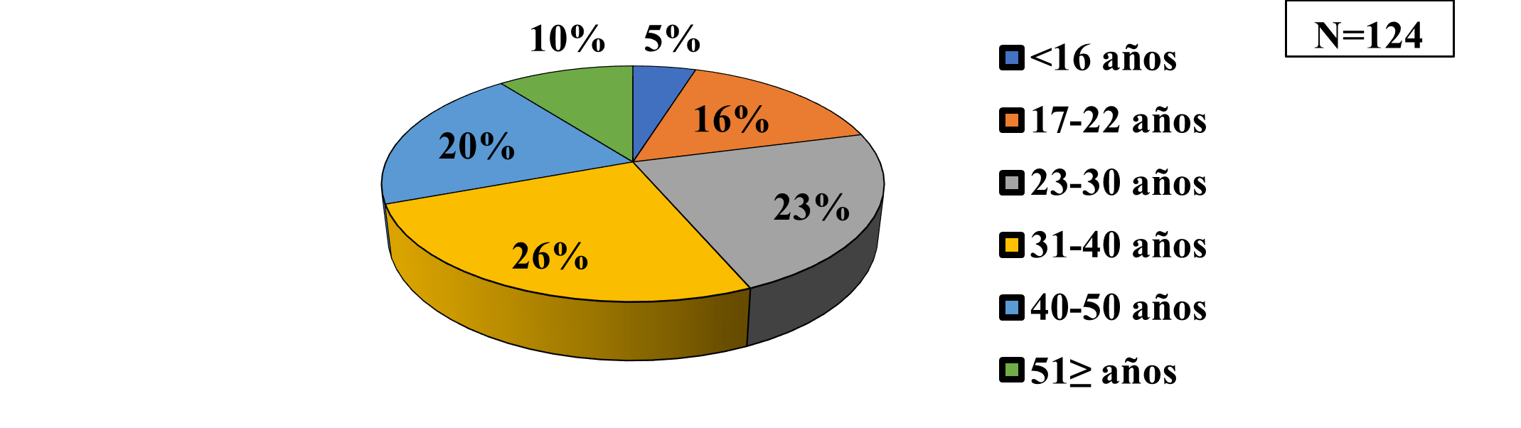 En el gráfico anterior, se observan los datos obtenidos del cuestionario realizado a los pacientes que acuden a la unidad odontológica especializada que participaron en este estudio. El 26% (32) de los pacientes refieren tener de 31 – 40 años, un 23% (28) de las personas tienen de 23 – 30 años de edad, 20% (25) de los pacientes poseen de 40 – 50 años de edad, un 16% (20) de los pacientes encuestados poseen de 17 – 22 años de edad, un 10% (13) de los pacientes encuestados poseen la de ≥51 años y un 5% (6) de las personas poseen <16 años de edad.