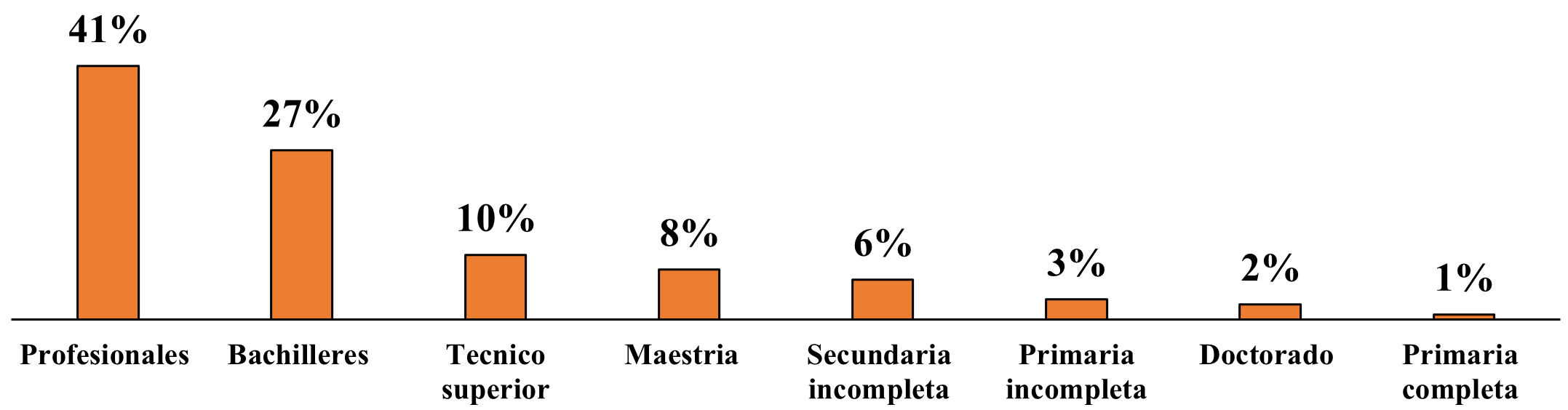 En cuanto al nivel de educativo de los pacientes que participaron en el estudio, se encontró que el 41% (51 pacientes) tienen formación profesional, el 27% (34 pacientes) son bachilleres, el 10% (13 pacientes) cuenta con formación técnica superior, y el 8% (10 pacientes) posee una maestría. Además, el 6% (8 pacientes) no culminó la educación secundaria, el 3% (4 pacientes) no completó la educación primaria, el 2% (3 pacientes) tiene un doctorado, y el 1% (2 pacientes) finalizó únicamente la educación primaria.