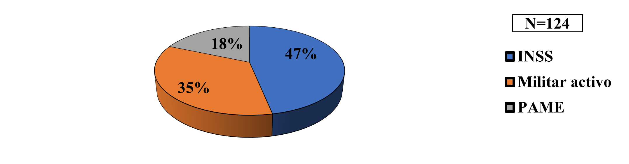 La mayor proporción de pacientes encuestados es del 47% (58) con categoría INSS, un 35% (43) de los pacientes encuestados son categoría Militar activo y el 18% (23) de los pacientes en estudio son categoría Programa de Atención Médica Especializada.
