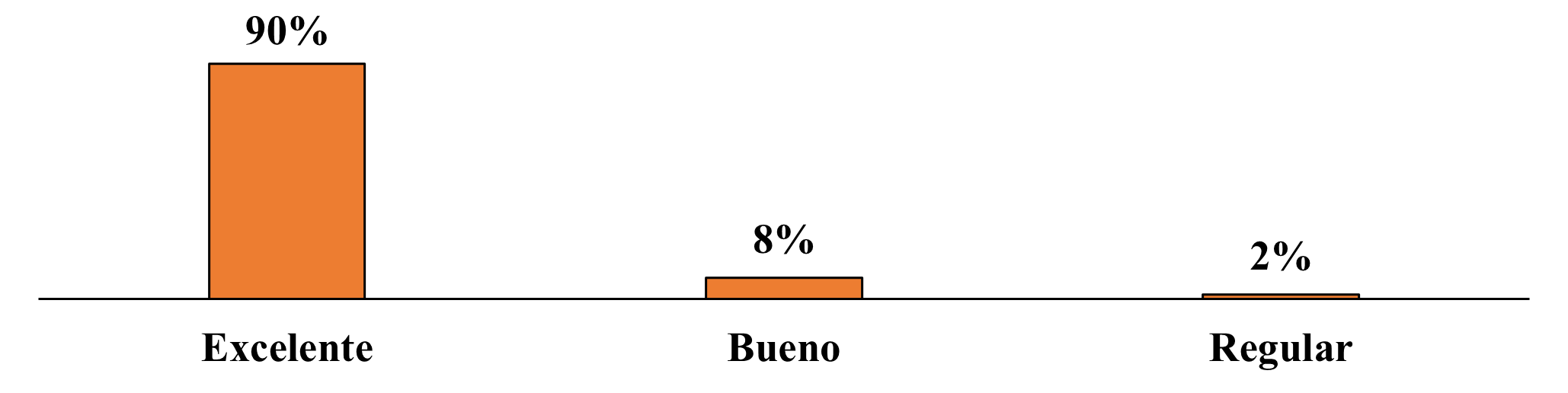 En esta figura se reflejan los datos de las condiciones de la estructura física de la unidad odontológica especializada, donde se observa que un 90% (112) de los pacientes indica que la unidad odontológica especializada posee una excelente estructura física, un 8% (10) de los pacientes refieren que la unidad odontológica especializada tiene una buena estructura física y un 2% (2) de los pacientes encuestados refieren que la unidad odontológica especializada posee una estructura física regular.
