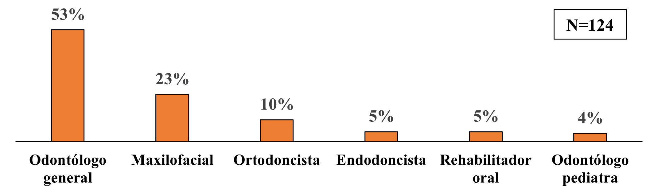 La información recolectada de quien lo atendió en la unidad odontológica especializada evidencia que un 53% (66) refirieron ser atendidos por un odontólogo general, un 23% (28) refirieron que lo atendió un maxilofacial, un 10% (13) refirieron que fueron atendidos por un ortodoncista, un 5% (13) refieren que fueron atendidos por un endodoncista, otro 5% (13) refieren que fue atendido por un rehabilitador oral y un 4% (5) refiere que un 4% (5) refieren que fueron atendidos por un odontólogo pediatra.