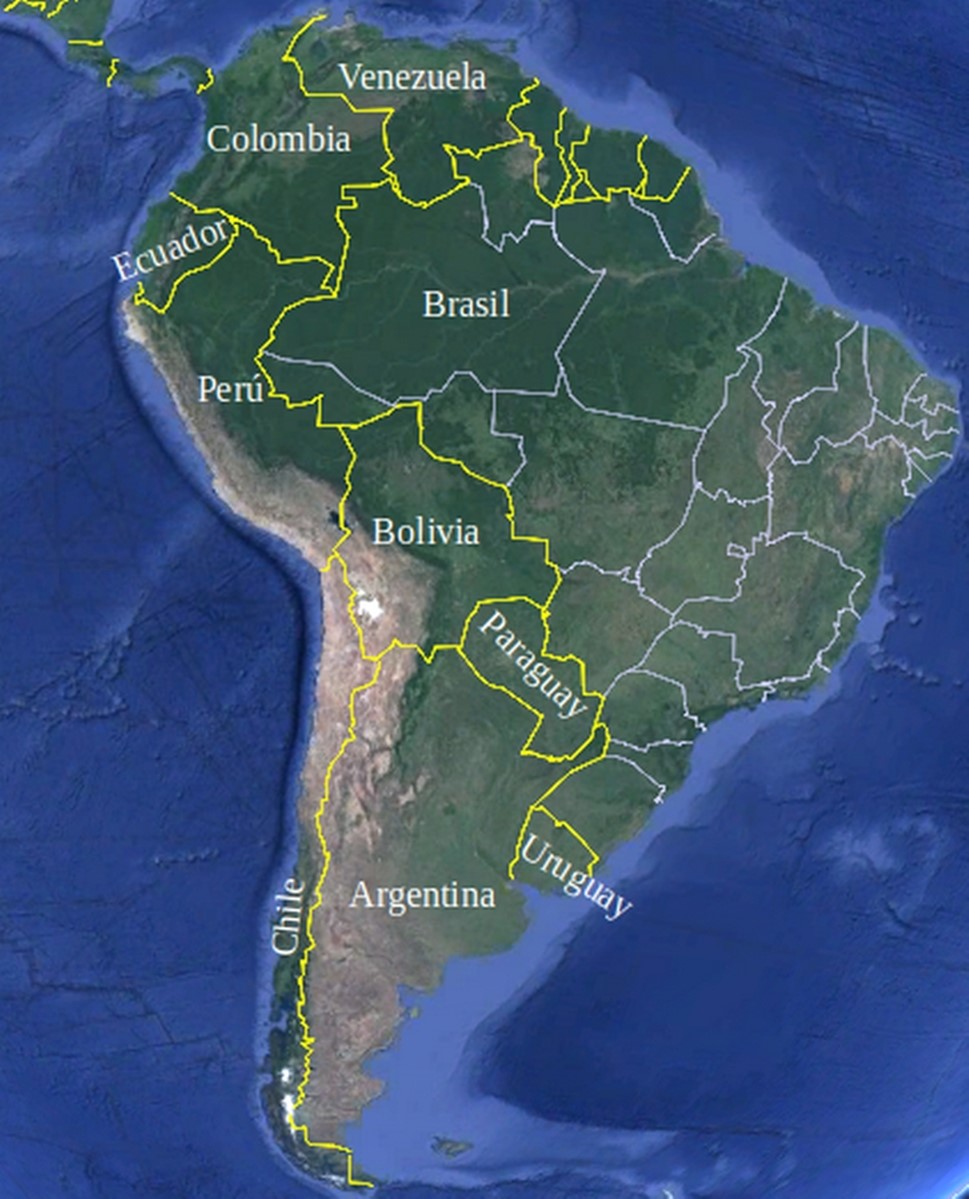 La investigación presenta un enfoque cuantitativo, de tipo documental, con nivel descriptivo-correlacional y diseño no experimental. El área de estudio estuvo constituida por todos los países de Sudamérica, tomándose como muestra 10 países: Argentina, Bolivia, Brasil, Chile, Colombia, Ecuador, Paraguay, Perú, Uruguay y Venezuela (Figura 1). Se descartaron de la muestra a Guyana y Surinam debido a que no presentaban datos para el año de estudio (último año de reporte 2016).